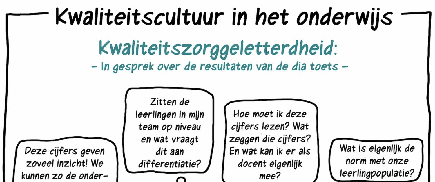 Kwaliteitszorggeletterdheid is niet iets waar alleen de kwaliteitsadviseur over dient te beschikken. Kwaliteitszorggeletterdheid wordt van iedere rol in de school/opleiding gevraagd om effectief te werken aan het monitoren, verbeteren en verantwoorden van de kwaliteit. Als je in gesprek gaat over data die verzameld zijn in de school, dan vraagt dat van alle betrokkenen, van kwaliteitsadviseur, directeur, teamleider en docent, om diverse competenties op dit gebied. Als we als voorbeeld de resultaten op de dia-toetsen gebruiken, dan dienen alle betrokkenen ten minste te weten wat de dia-toetsen meten (de basisvaardigheden) en waarom deze gemeten worden (veel leerlingen in Nederland scoren onder de norm en zodoende vraagt dit om extra maatregelen om de resultaten naast te monitoren ook gericht te kunnen verbeteren). Dat wetende, moet je ook weten voordat je met elkaar in gesprek kunt over de cijfers hoe je de cijfers moet lezen en interpreteren, wat de landelijke norm is en of die norm passend is bij de eigen leerlingpopulatie, voordat je met elkaar erop kunt reflecteren en in gesprek kunt gaan over wat de cijfers zeggen over jullie leerlingen, wat er goed gaat en waar verbeteringen wenselijk zijn. Dit voorbeeld laat zien dat je, om in gesprek te gaan over data, dat alle betrokkenen een mate van kwaliteitszorggeletterdheid moeten bezitten om een zinvol gesprek te kunnen voeren over de data en te kijken naar vervolgstappen o.b.v. de data.