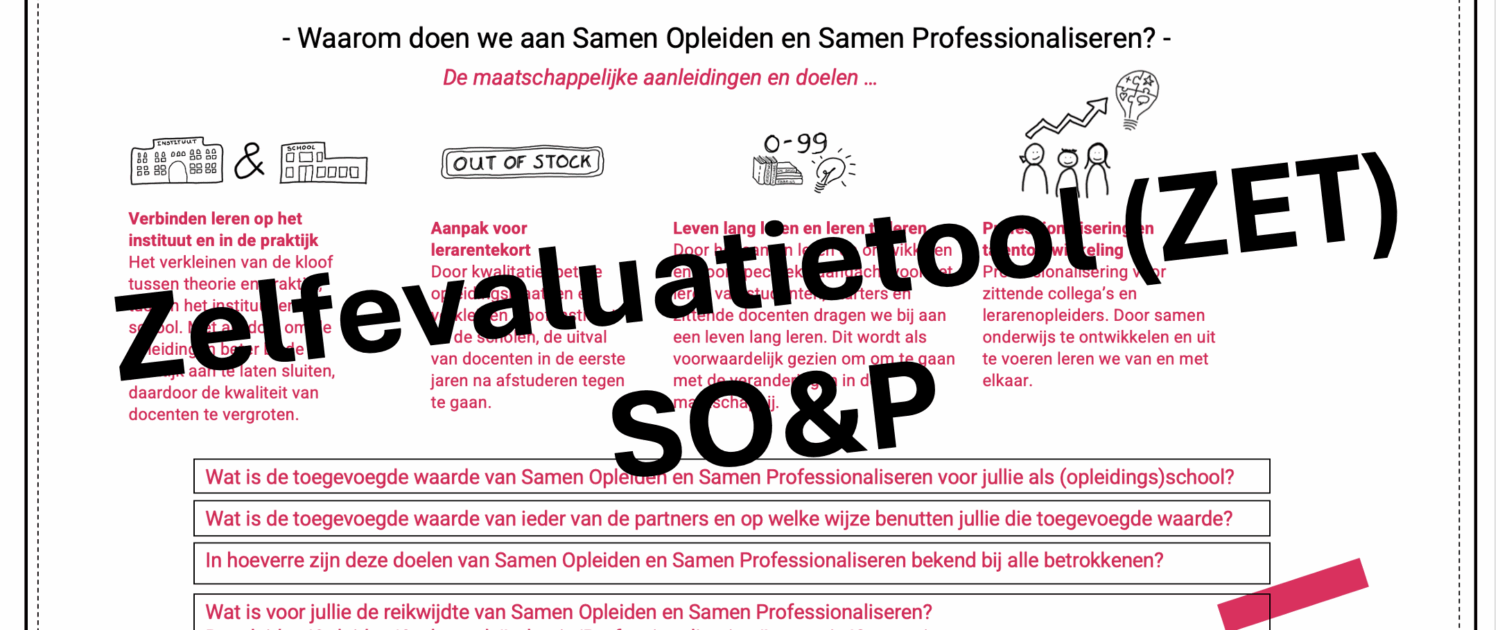 De zelfevaluatietool (ZET) Samen Opleiden en Professionaliseren biedt opleidingsscholen de mogelijkheid om op een actieve manier samen inzicht te krijgen in waar de opleidingsschool qua ontwikkeling staat en hoe dit voor de verschillende locaties het geval is. Voorheen heette dit instrument de Passietool en was het in beheer van Passie voor leren. Inmiddels is de tool overgenomen door de HAN en is het materiaal recent geüpdatet en aangevuld. Daarom vonden we het ook tijd worden voor een nieuwe naam, te weten ZET: ZelfEvaluatieTool Samen opleiden & Professionaliseren.